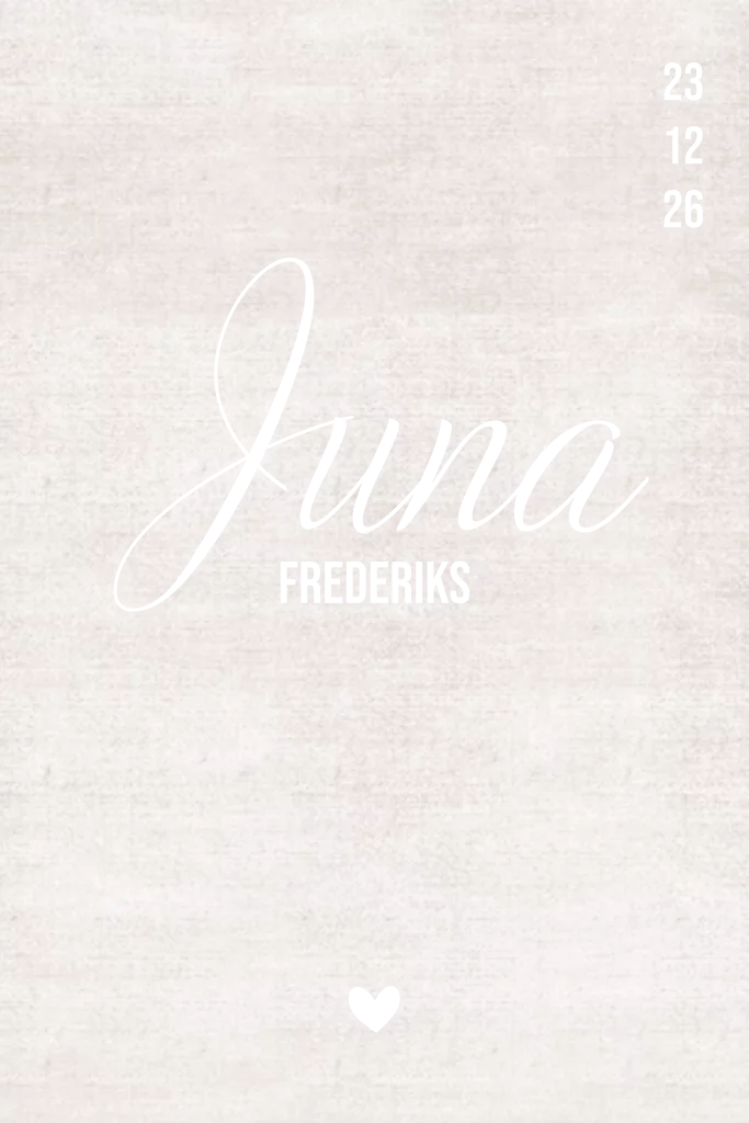 Lief geboortekaartje voor een meisje met zandkleur linnen look achtergrond en goudfolie. Op de voorkant een datum en naam in goudfolie. Meisjesnaam Juna