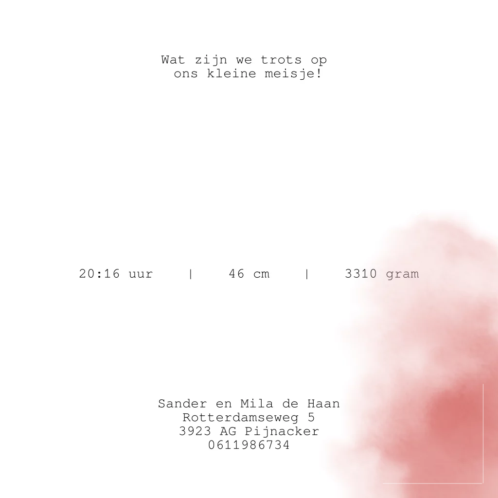 Lief geboortekaartje voor een meisje met een bij elkaar gebonden bosje bloemen in goudfolie en waterverfvlekken in oudroze op de achtergrond.