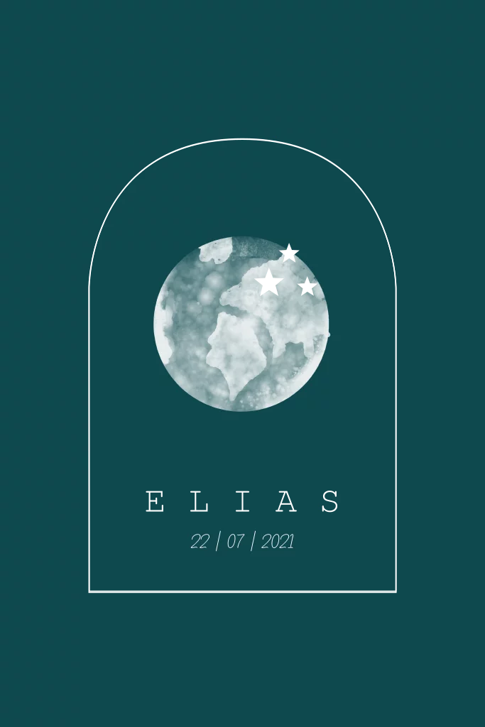 Mooi stoer geboortekaartje voor een jongetje met een witte wereldbol tegen een turquoise achtergrond. De sterren in goudfoliedruk maken dit kaartje helemaal af!