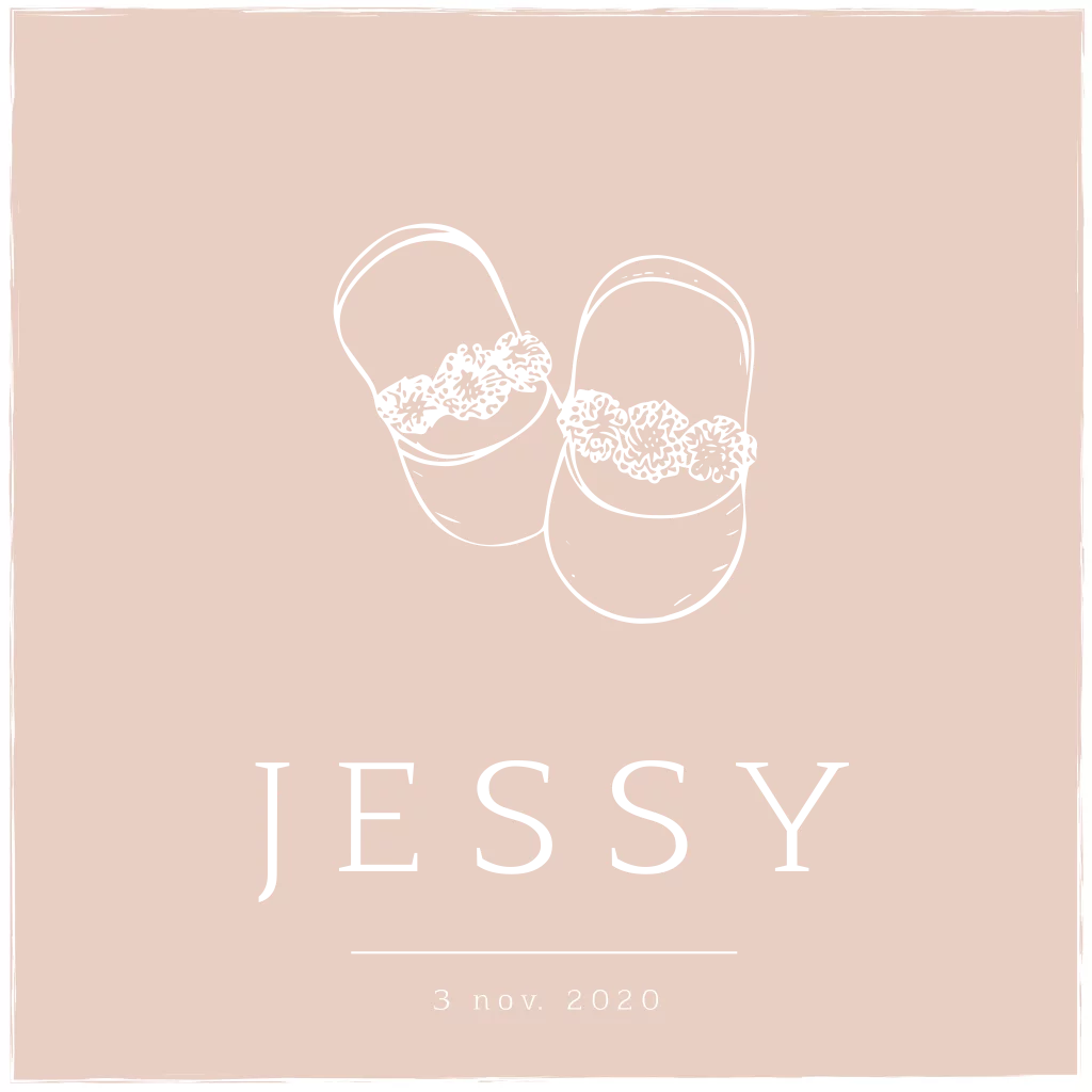Speels oudroze geboortekaartje voor een meisje met lieve schoentjes in goudfolie.