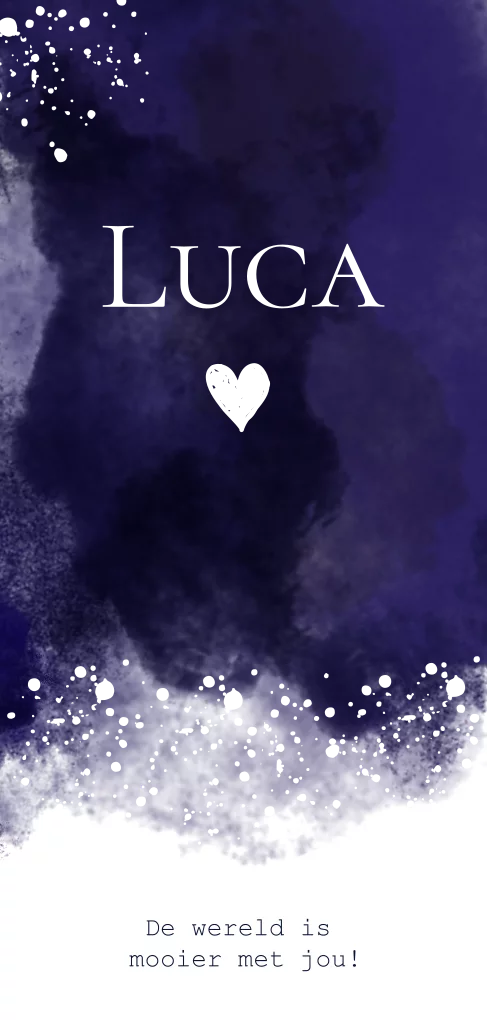 Stoer geboortekaartje met donkerblauwe waterverf, goudfolie en goudspetters.