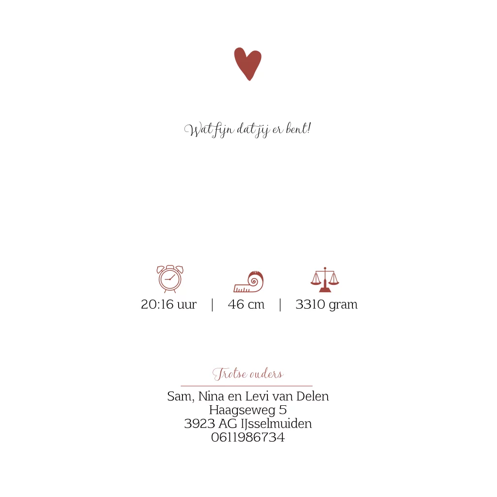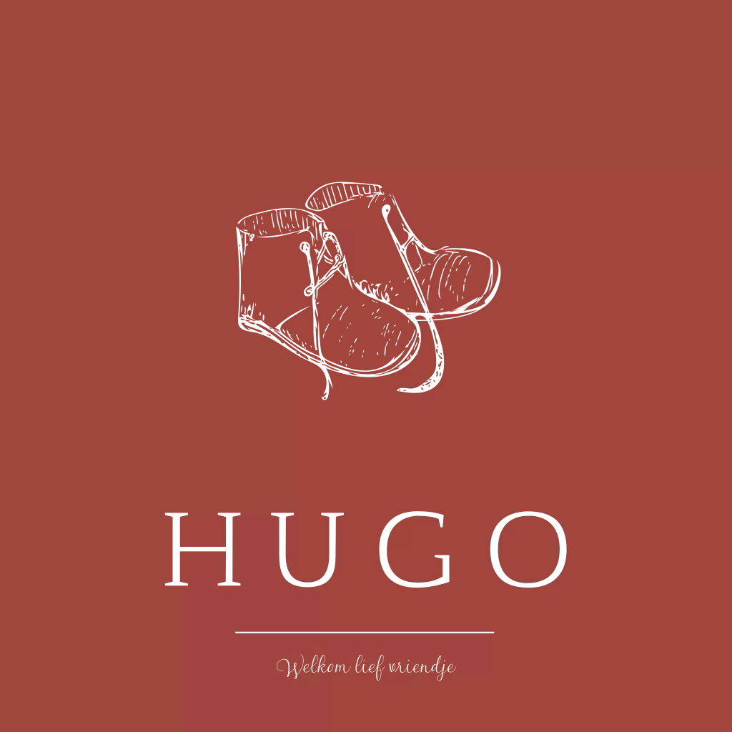 Stoer geboortekaartje voor een jongen met schoentjes. Het geboortekaartje heeft een mooie combinatie van kleuren met het rood op de achtergrond en de naam en schoentjes in goudfolie.