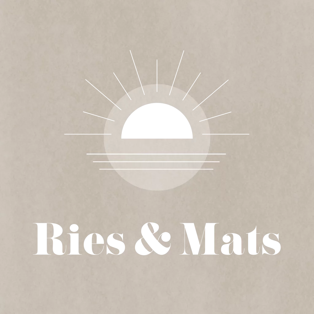 Stoer tweeling geboortekaartje voor jongetjes met zandkleur achtergrond en een zonnetje in goudfolie. Jongensnamen Ries & Mats.