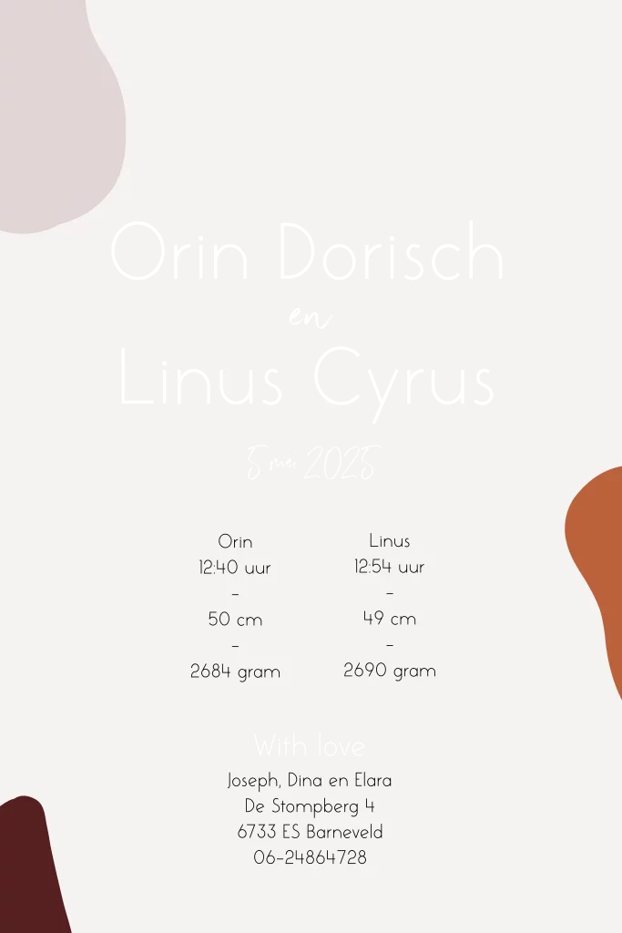 Lief tweeling geboortekaartje met foto en abstracte vormen en lijnen. Pas het kaartje naar wens aan in de editor.