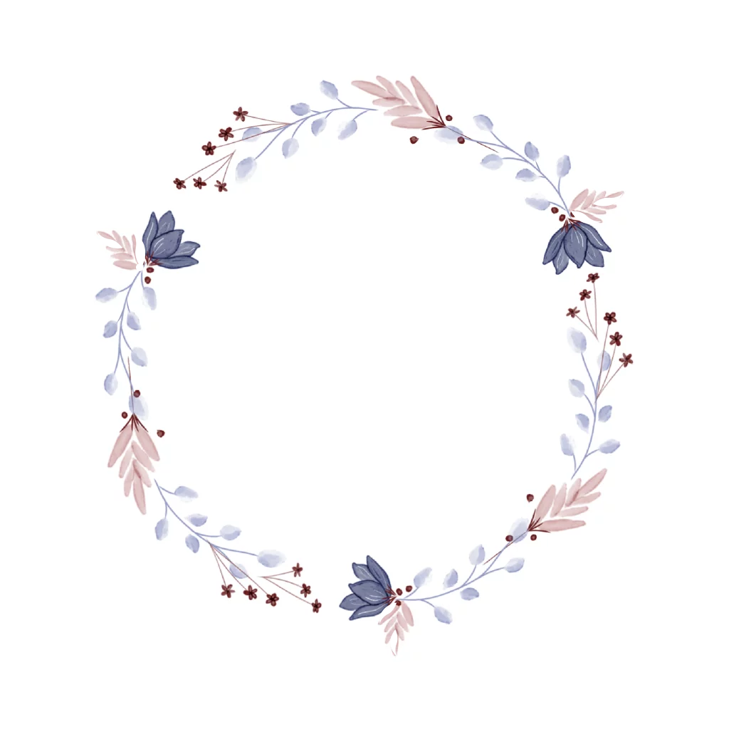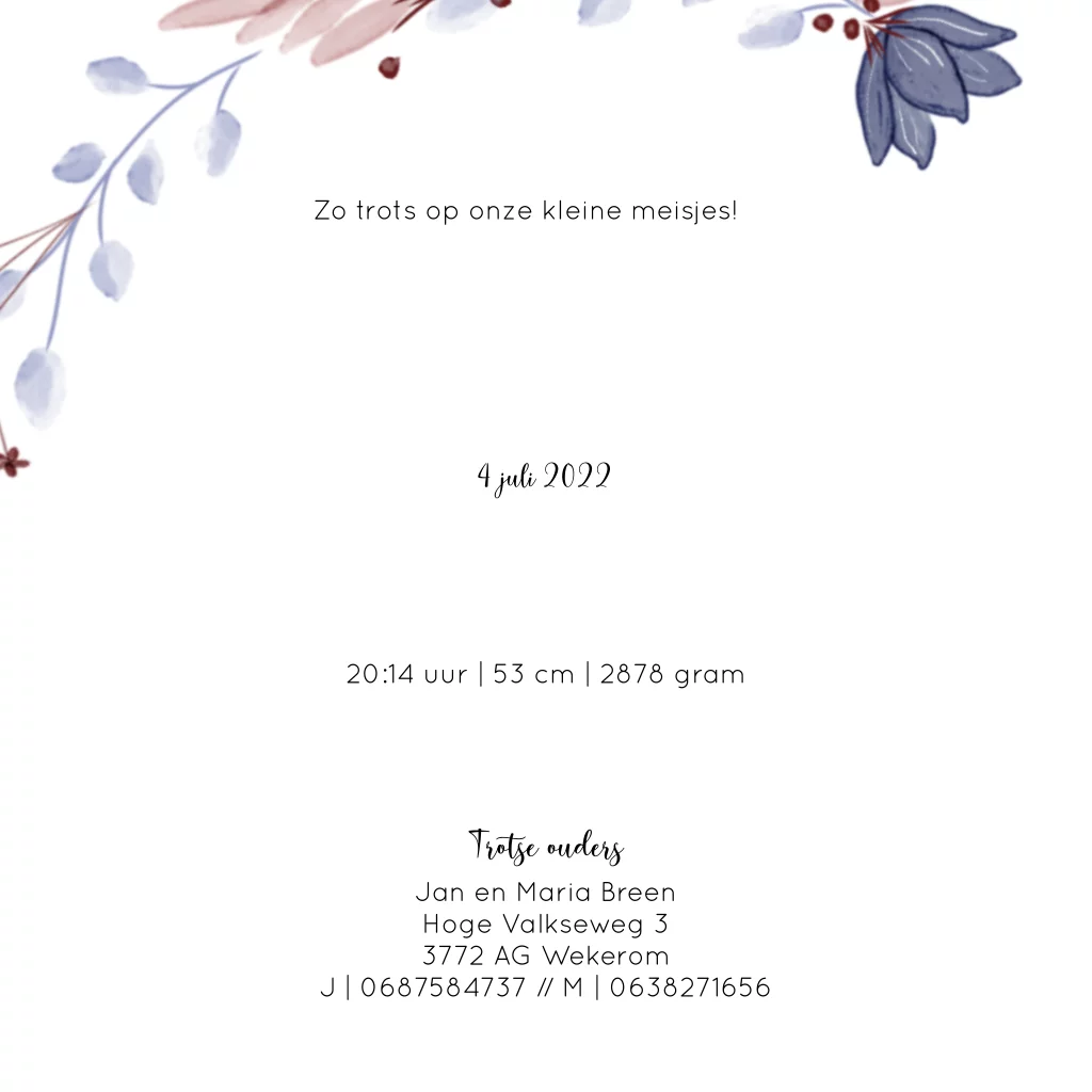 Mooie vierkante vrolijke geboortekaart met bloemen in een krans in de kleuren lila, dusty blue en roze. Voorzien van rosegouden foliedruk. Mooi voor een meisjes tweeling.