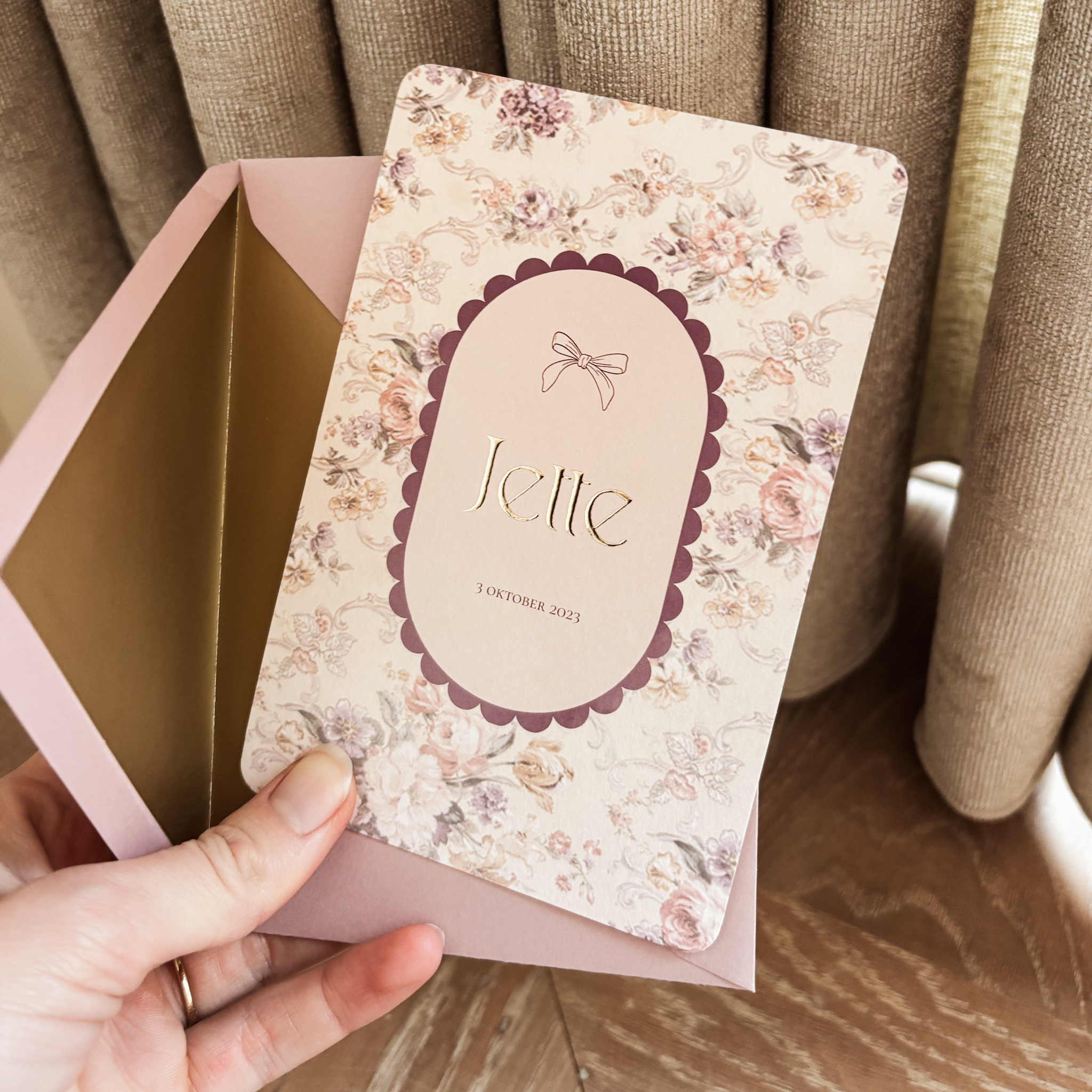 Echt uniek nostalgisch geboortekaartje met lieve bloemetjes en goudfolie. De kaart is opgemaakt met paars en roze maar je kunt de kleuren ook gemakkelijk wijzigen in de online editor.