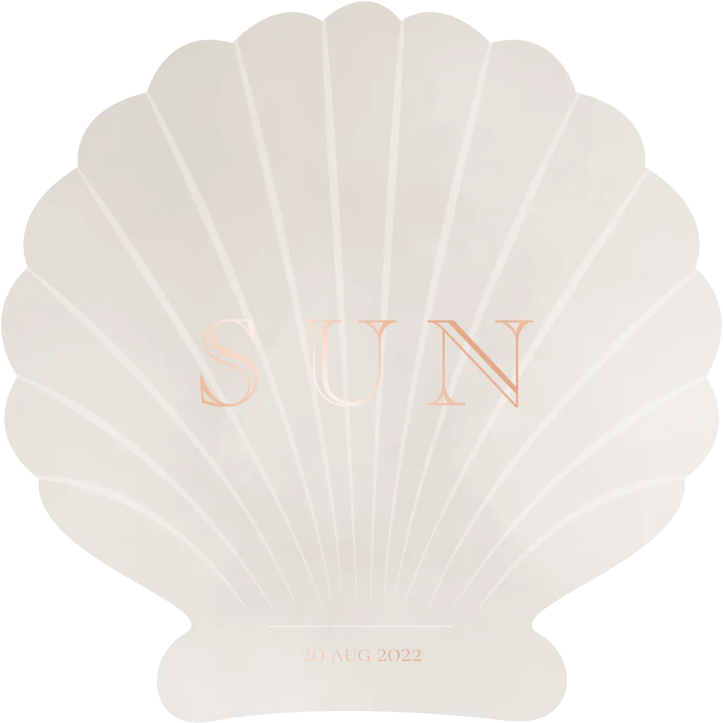 Schelpvorm geboortekaartje met folie en de jongensnaam Sun.