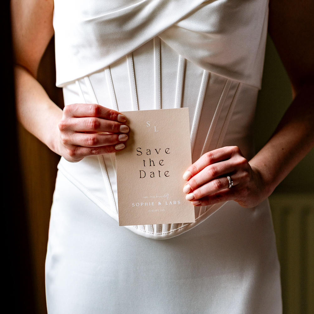 Een mooie, naturel Save the Date met goudfolie en witte tekst. De kaart is opgemaakt in natuurlijke kleuren en past goed bij de trouwhuisstijl.