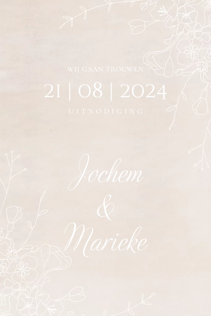 Chique linnenlook trouwkaart met folie en mooie bloemen op de achtergrond. Klassiek ontwerp met een romantische uitstraling.