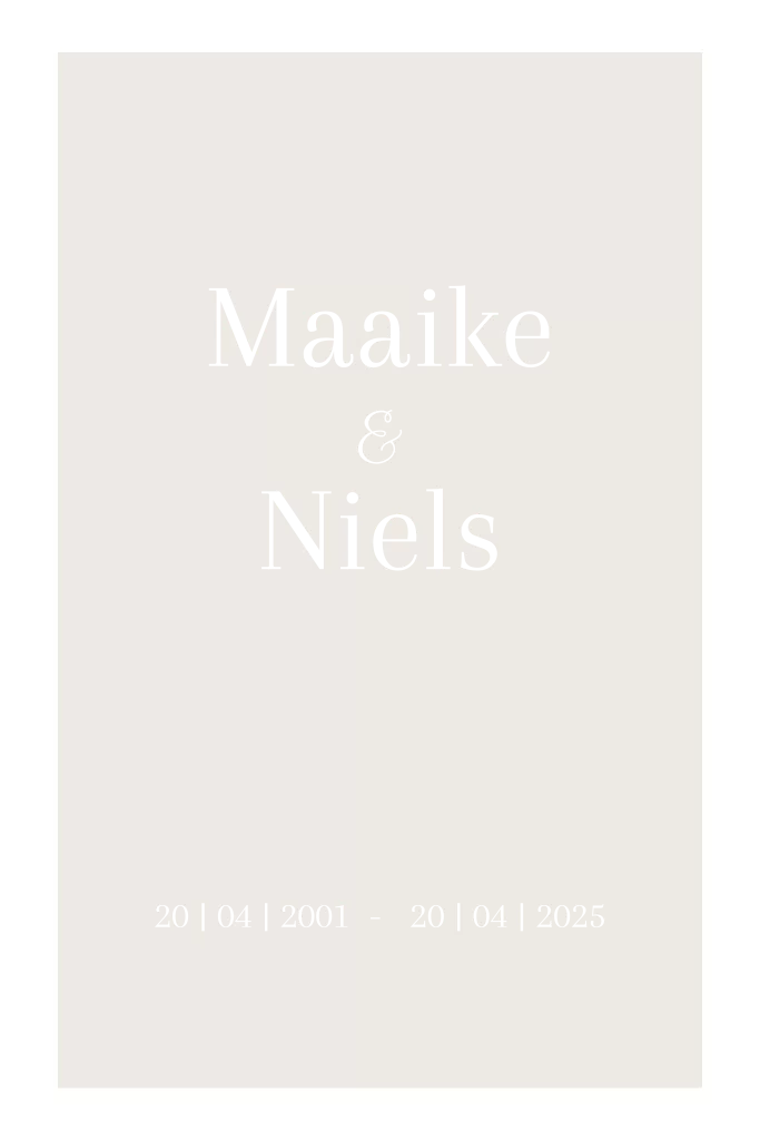Chique zandkleur jubileumkaart met folie en icoontjes van locatie, diner en champagneglazen. Je kunt de dagplanning op de jubileumkaart naar wens uitbreiden met icoontjes uit de editor of daarnaast een dagplanning of labelkaartje toevoegen.