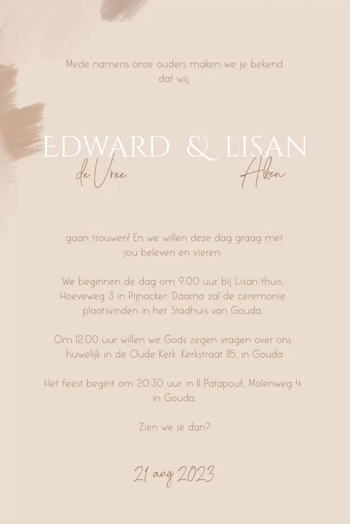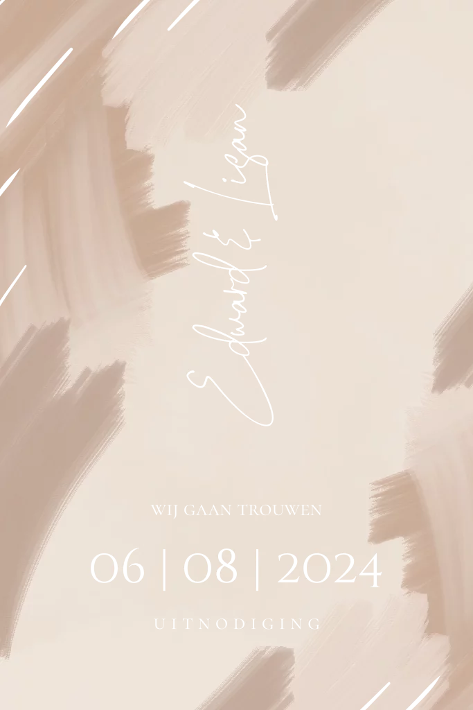 Dubbele trouwkaart in natuurlijke kleuren als zand en oudroze en mauve met goudfolie. De kaart is voorzien van subtiele verfstrepen in warme, natuurlijke tinten.