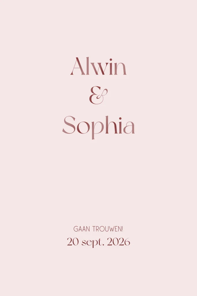 Lichtroze trouwkaart met bordeauxrode tekst. Deze kaart hoort bij een trouwhuisstijl (Bordeaux Roze) en kan ook voorzien worden van de bijpassende kalkpapier omslag.