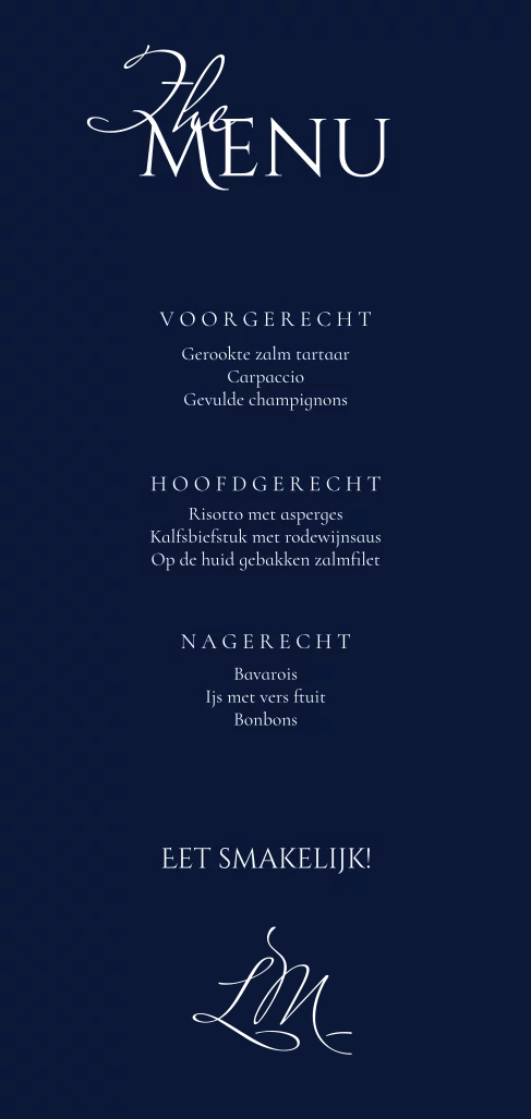 Classical Blue menukaart met goudfolie en witte tekst. Je kunt dit ontwerp helemaal naar wens aanpassen!
