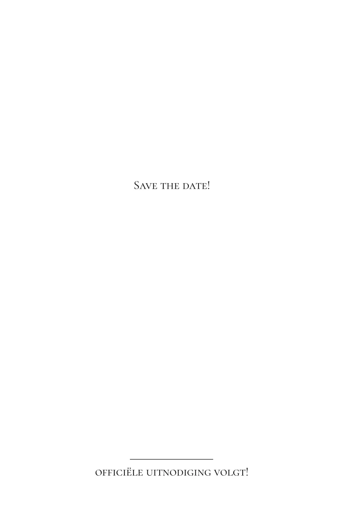 Minimalistische save the date met foliedruk, een sierlijk lettertype en een trouwlogo. Pas het kaartje aan door een achtergrondkleur toe te voegen!