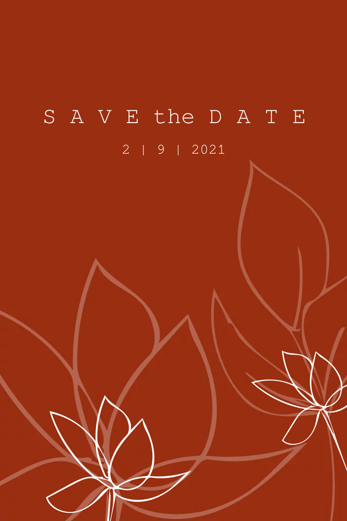 Roestbruine of bordeauxrode save the date met een lijntekening van bloemen en blaadjes. De save the date is voorzien van goudfolie.