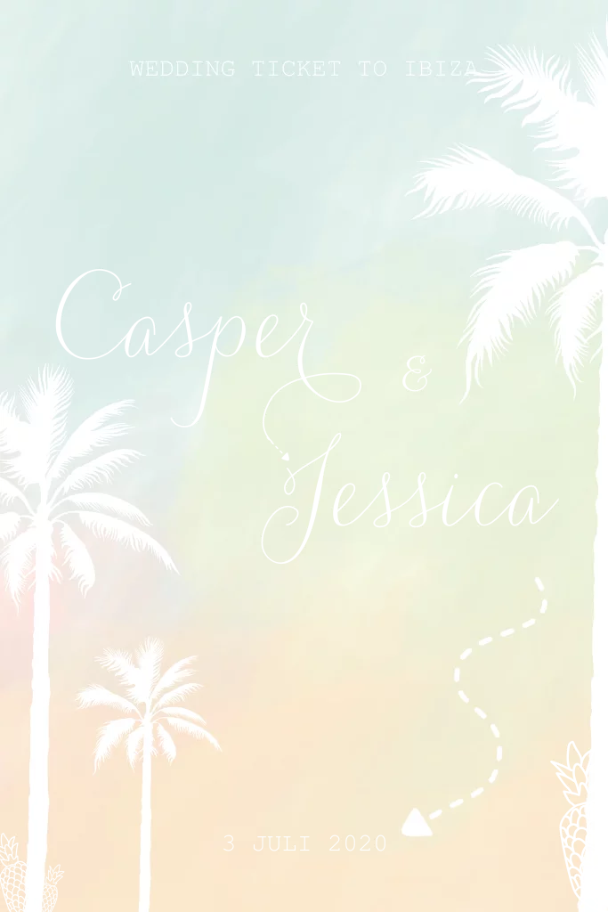 Tropische Save the date kaart voor een bruiloft op Ibiza of een andere mooie plek op deze wereld. Of voor als je gewoon van reizen houdt.