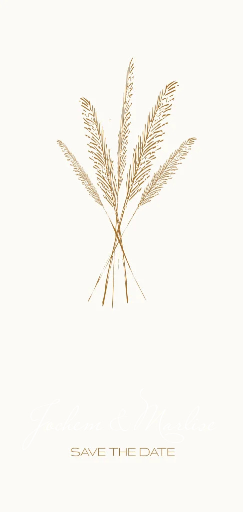 Save the date in de kleuren crème met camel, voorzien van goudfolie. Er is een bijpassend trouwkaartje te vinden op deze site. Natuurlijk kun je alles zelf naar wens aanpassen in de editor!