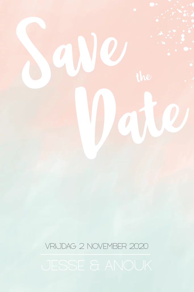 Save the date met waterverf in groen en perzikkleur. Met tekst en spetters in goudfolie!