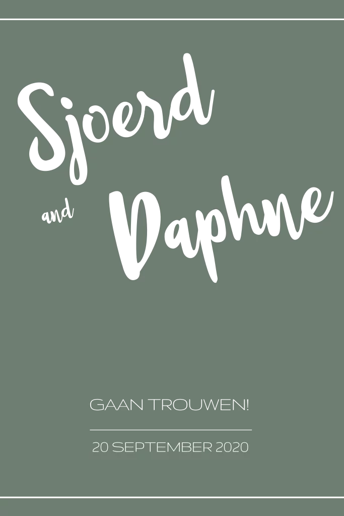 Minimalistisch trouwkaartje met strepen en naam in goudfolie en een groene achtergrond. Je kunt dit trouwkaartje heel anders maken door het lettertype en de achtergrond aan te passen. Probeer maar raak!