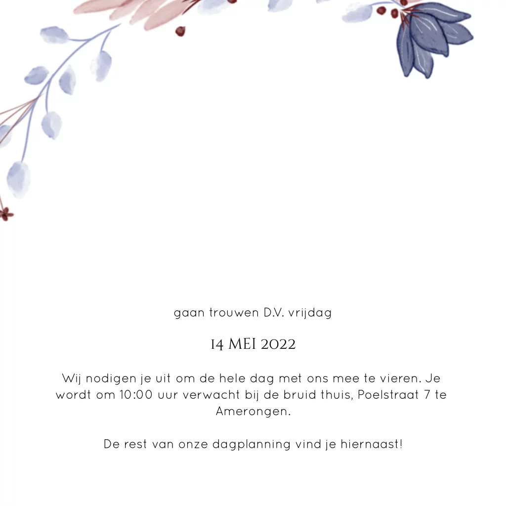 Vrolijke trouwkaart met bloemen in dusty blue en rosegouden folie
