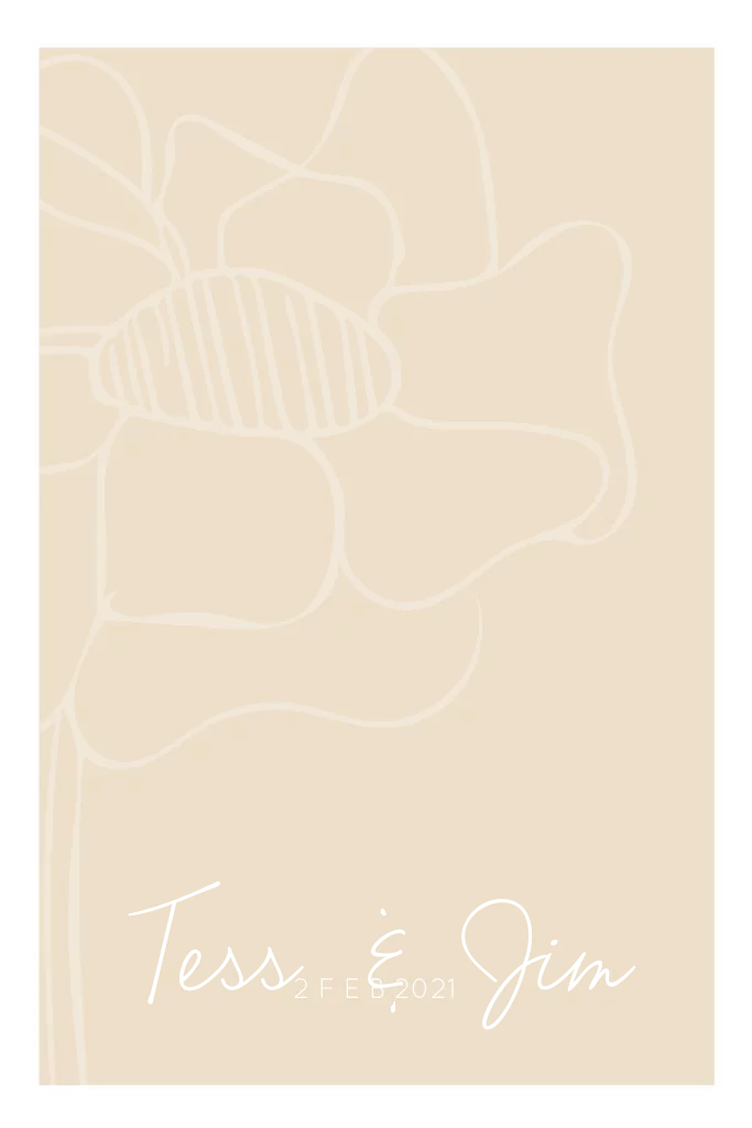 Zandkleur trouwkaartje met een lijntekening van bloemen en folie. Het kaartje is naar wens aan te passen door te kiezen voor een andere achtergrondkleur of een andere bloem.