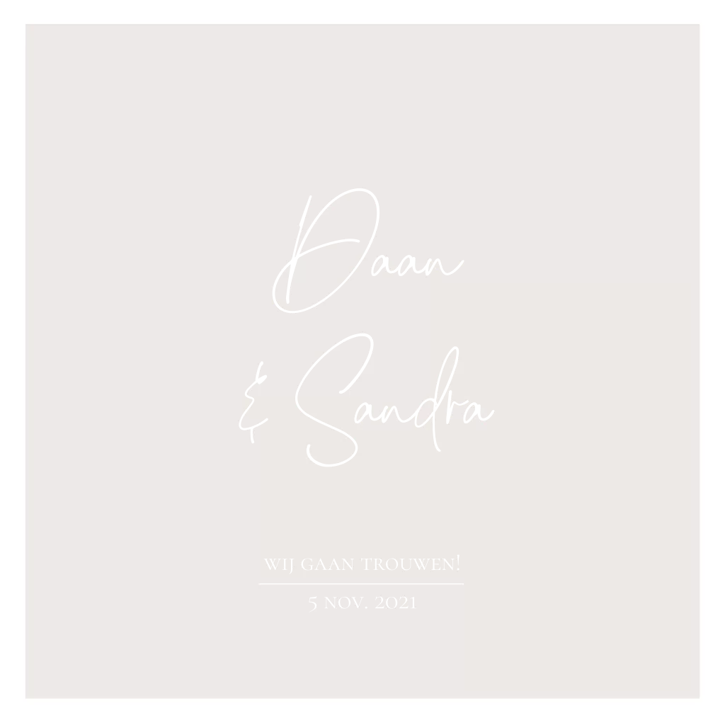 Chique zandkleur trouwkaart met een witte rand. Het kaartje is voorzien van folie voor een extra luxe uitstraling! Tip: je kunt deze kleur zand iets donkerder maken door te schuiven bij de transparantie.
