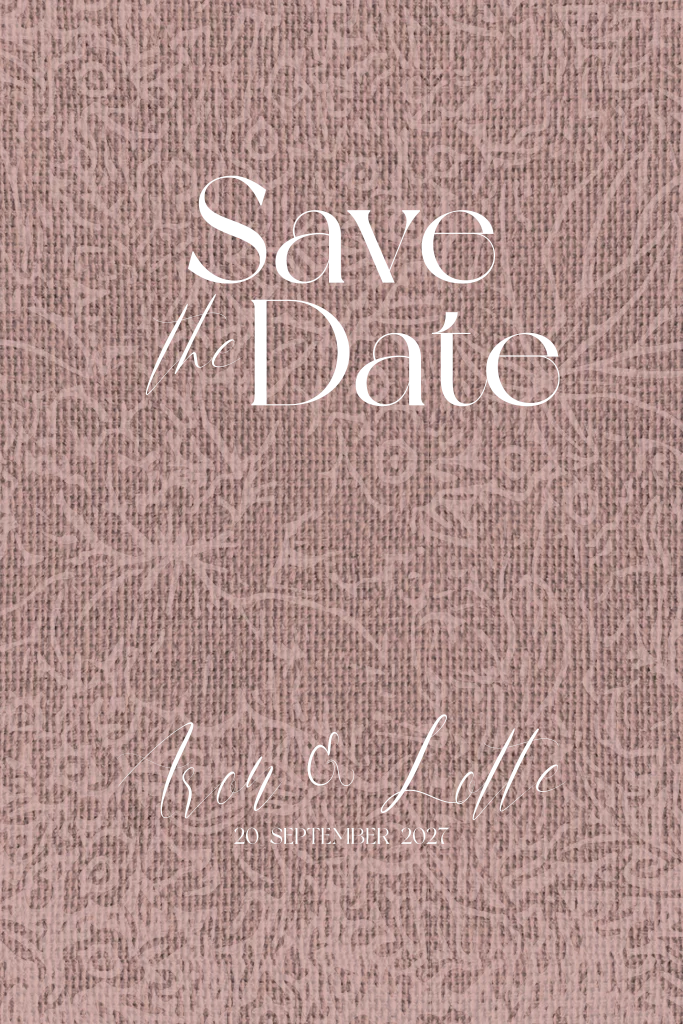Unieke en prachtige save the date met een linnenlook patroon achtergrond. Je kunt deze kaart helemaal naar wens aanpassen!