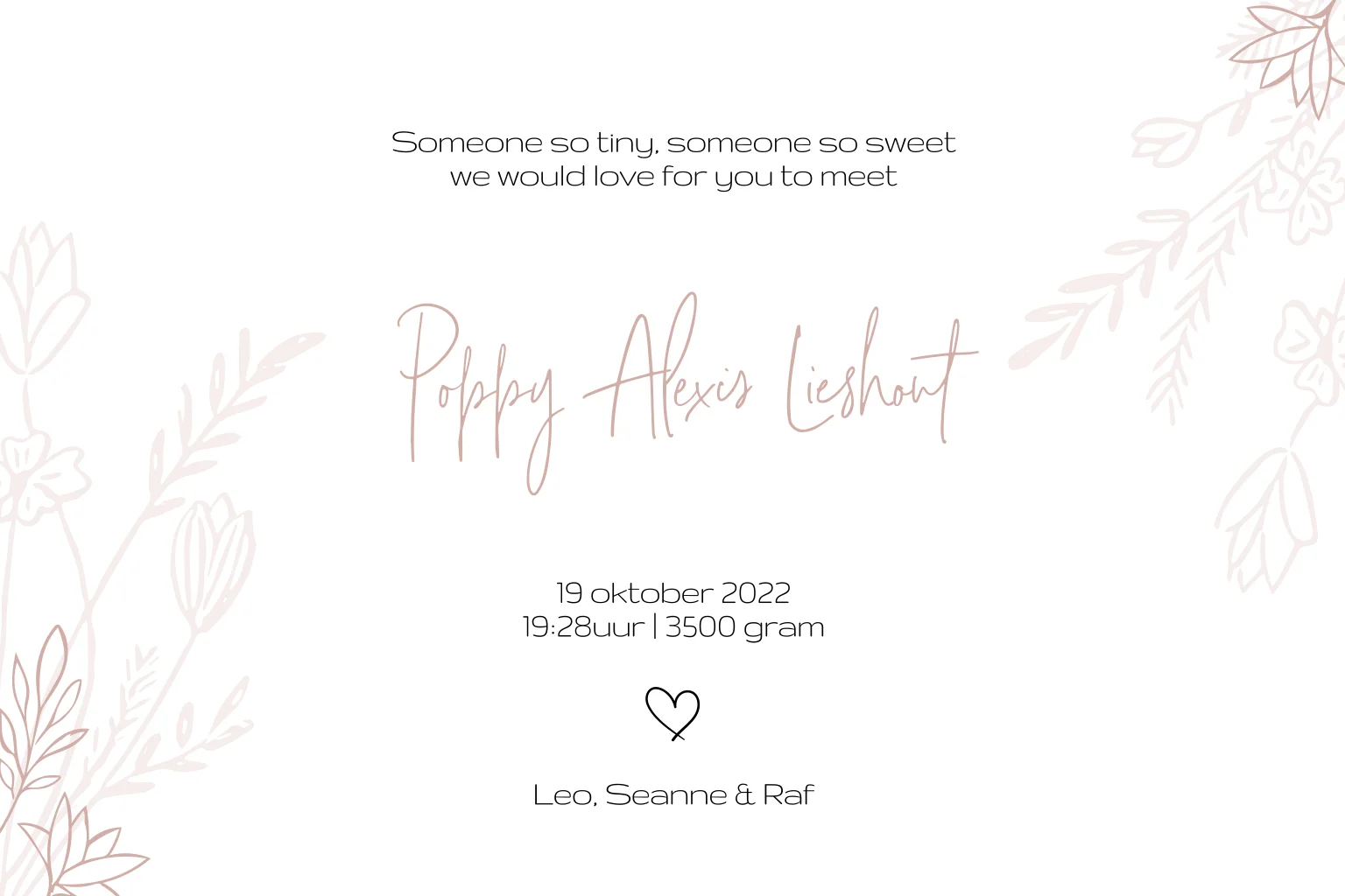 Lief geboortekaartje voor een meisje met bloemen en goudfolie. Mooi met een velvet lintje of een linnen lint.
