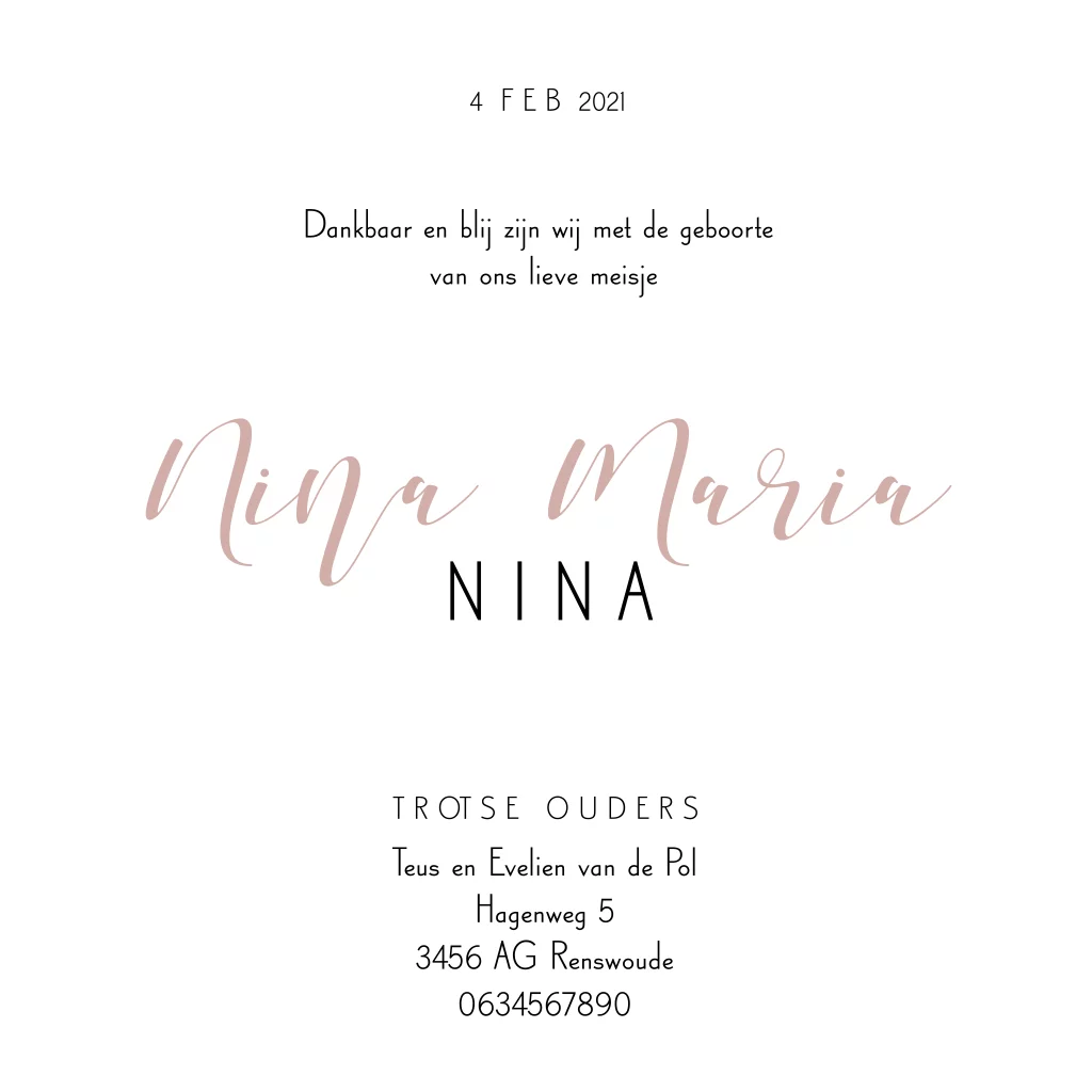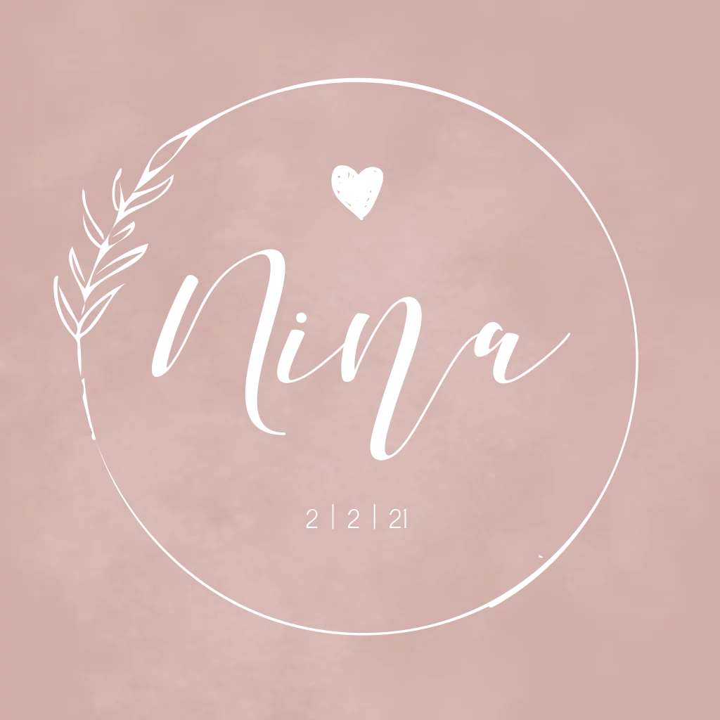 Lief geboortekaartje met een krans en een takje en rosegouden folie. De achtergrond is oudroze. Misschien leuk om te weten: het kransje is met de hand getekend.