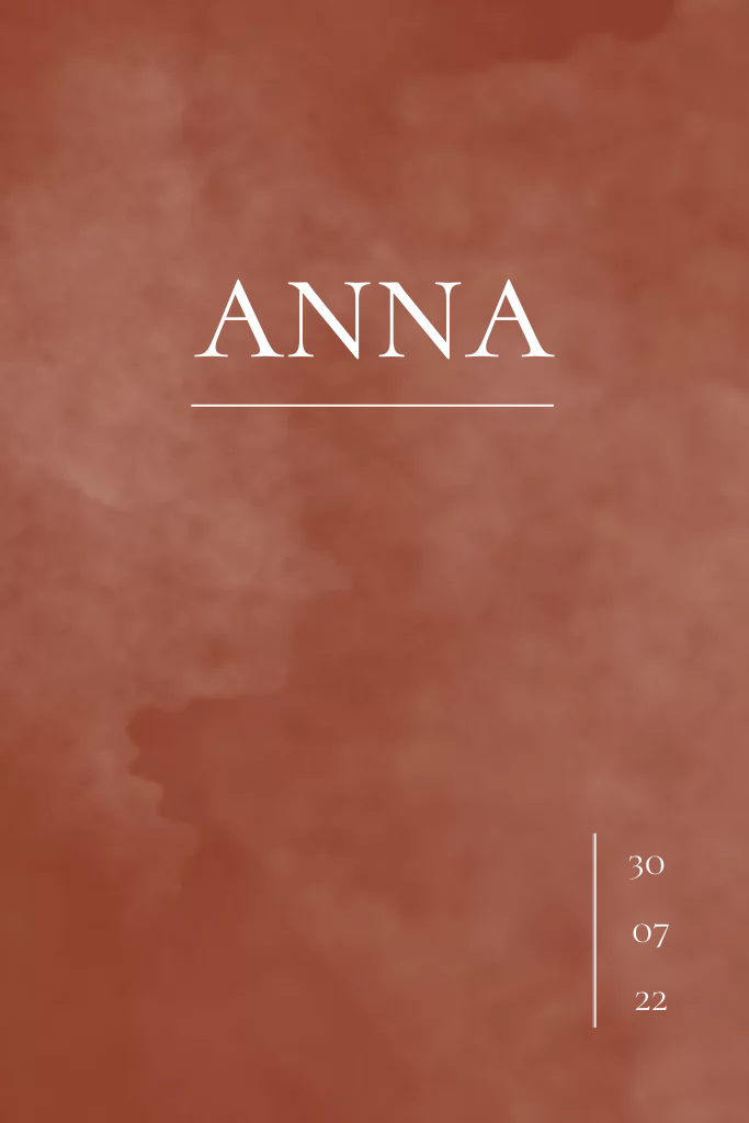 Lief geboortekaartje voor een meisje met roestkleur achtergrond en goudfolie. Op de voorkant een datum en naam in goudfolie.