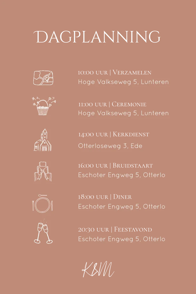 Mooie dagplanning in de kleur roest/terra met goudfolie en icoontjes. Het kaartje kan helemaal naar wens worden aangepast!
