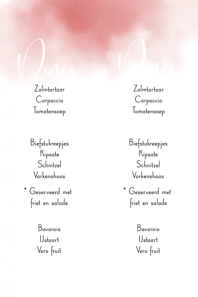 Mooi menukaartje voor jullie bruiloft. Dit kaartje past bij de complete huisstijl in oudroze met goudfolie. Liever een andere kleur? Pas het menukaartje gemakkelijk aan in de editor.