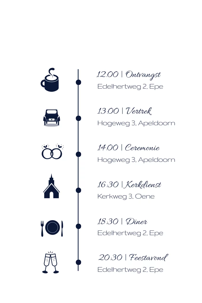 Donkerblauwe dagplanning met goudspetters! Leuk voor bij de complete huisstijl of voor in een pocketfold, samen met het bijpassende trouwkaartje.