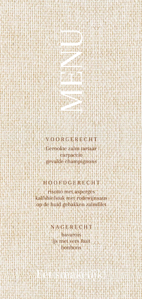 Linnenlook minimalistische menukaart. Passend bij de complete trouwhuisstijl van deze bruiloft.