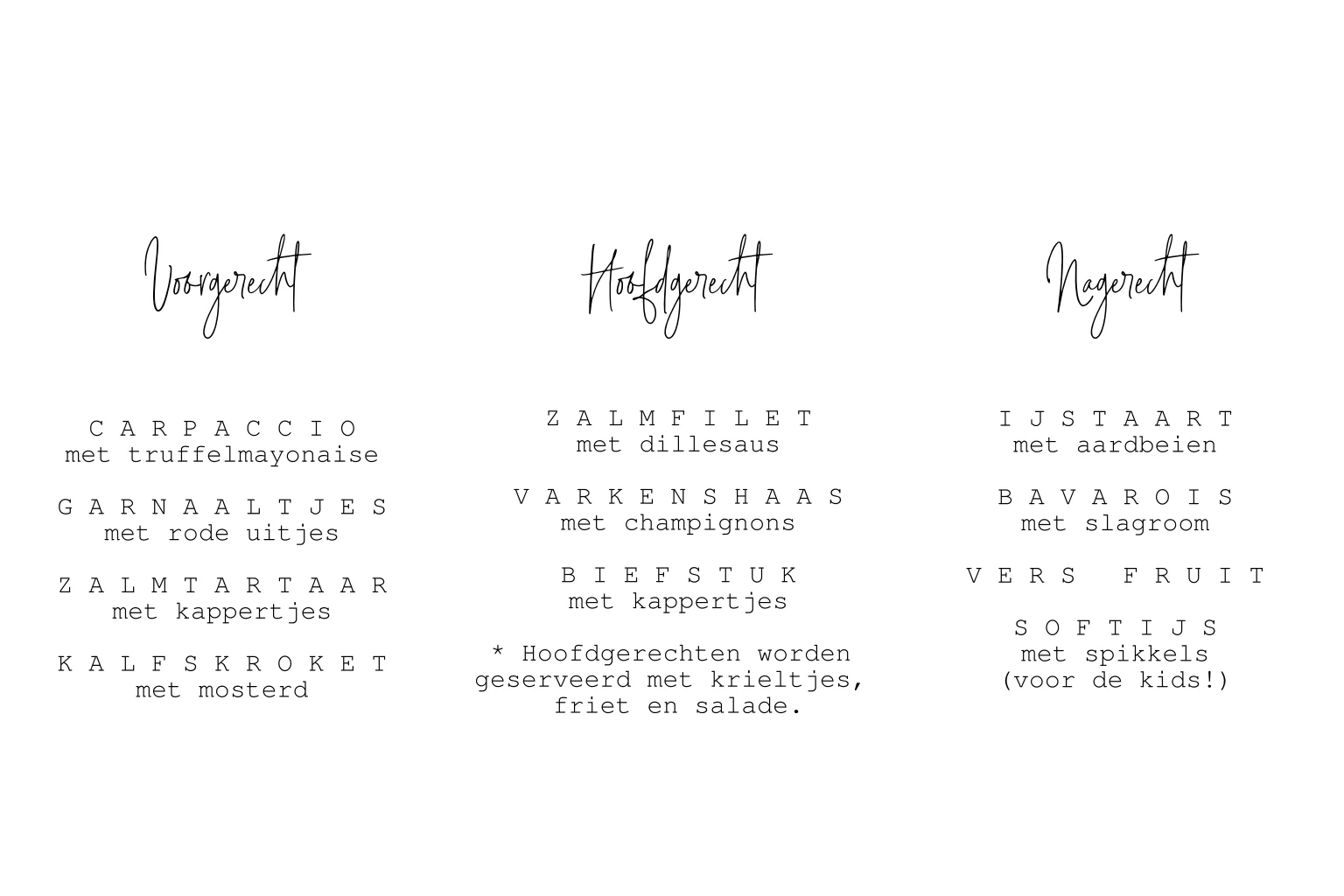 Menukaart voor een bruiloft met roségouden foliedruk en een perzikkleurige achtergrond.