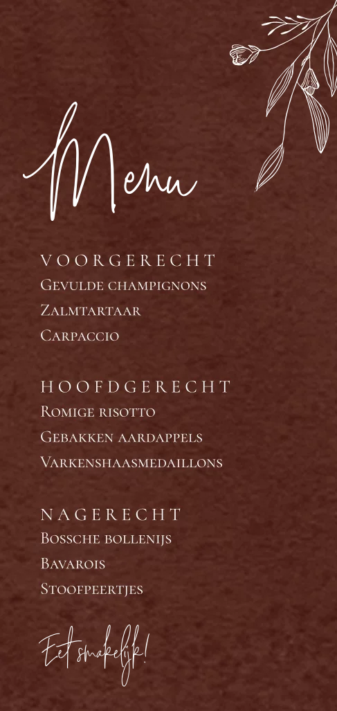 Mooi menukaartje voor jullie bruiloft met letters in een sierlijk lettertype in goudfolie en waterverf vlekken.
