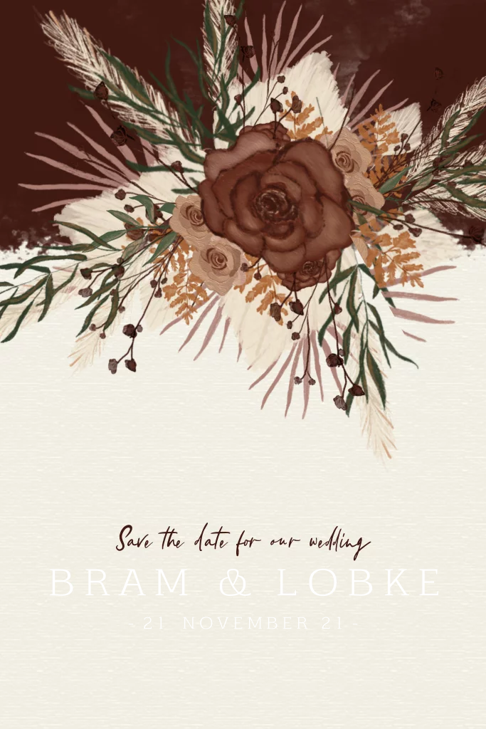 Mooie save the date met roest, creme, beige en bloemen. De kaart is gemaakt in natuurlijke winterse kleuren.