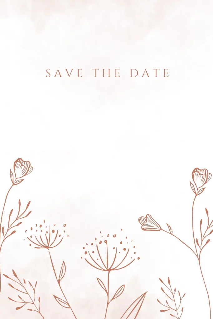 Save the date in wit met roestkleur en veldbloemen. Pas de kleur van deze save the date aan of kies voor een andere achtergrond om het kaartje helemaal naar wens te maken!