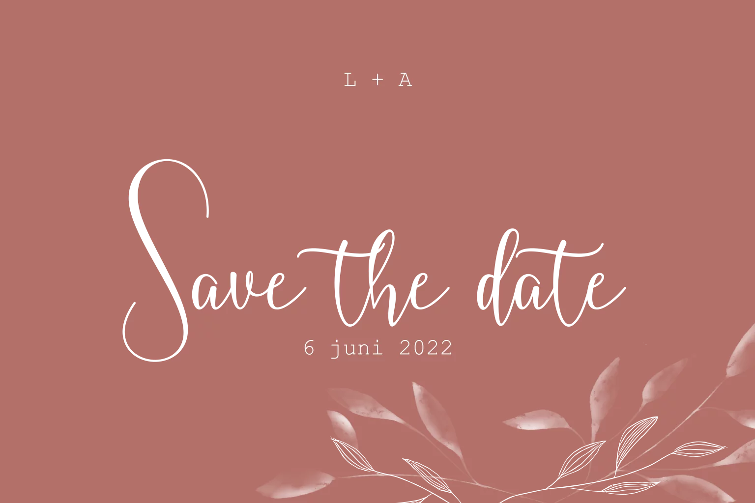 Mooie save the date met een oudroze of rode achtergrond en goudfolie. Deze save the date heeft een bijpassend trouwkaartje!