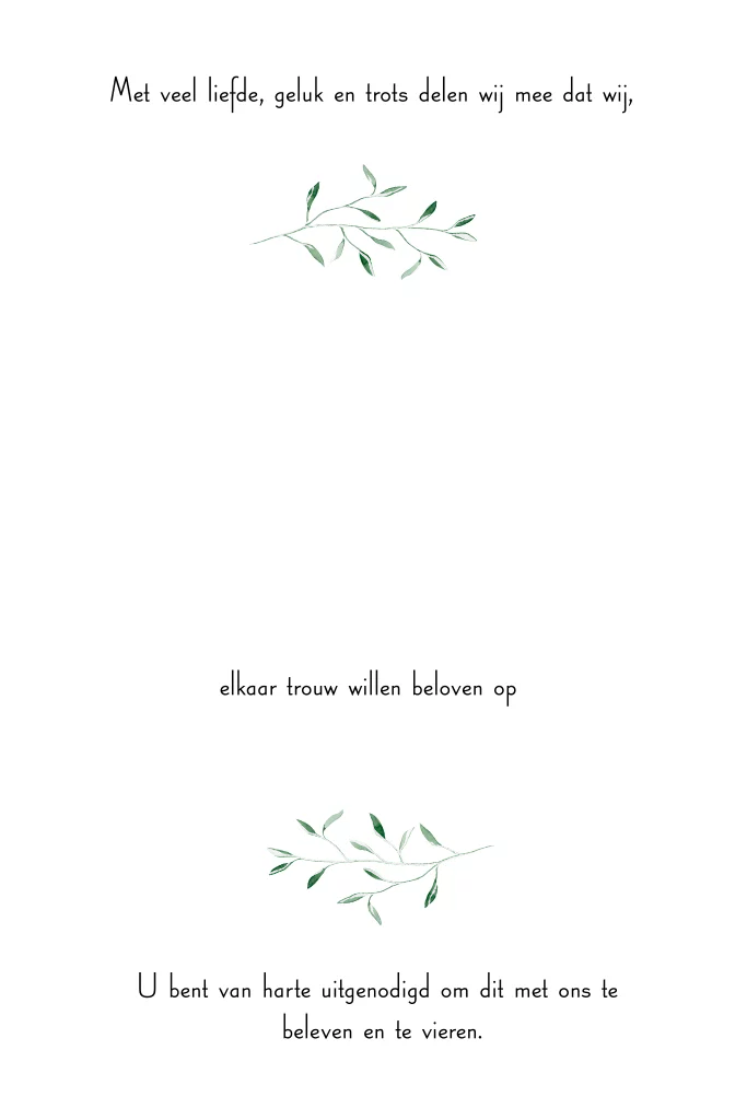 Mooi botanisch trouwkaartje met goudfolie en takjes. Perfect voor in een pocketfold mapje.