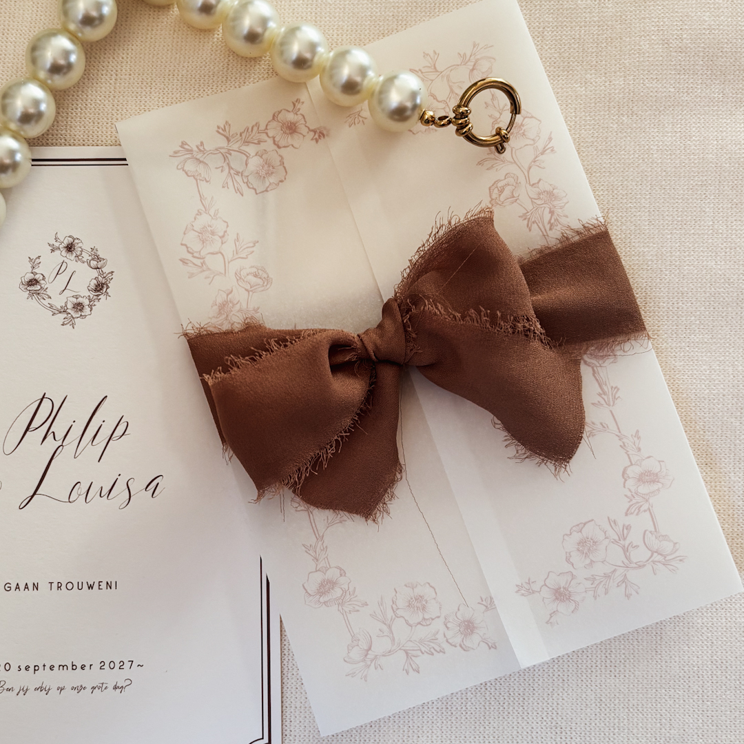 Kalkpapier omslag met beige bloemen. Je kunt deze omslag helemaal naar wens aanpassen. Passend bij trouwhuisstijl Gentle Bloom.