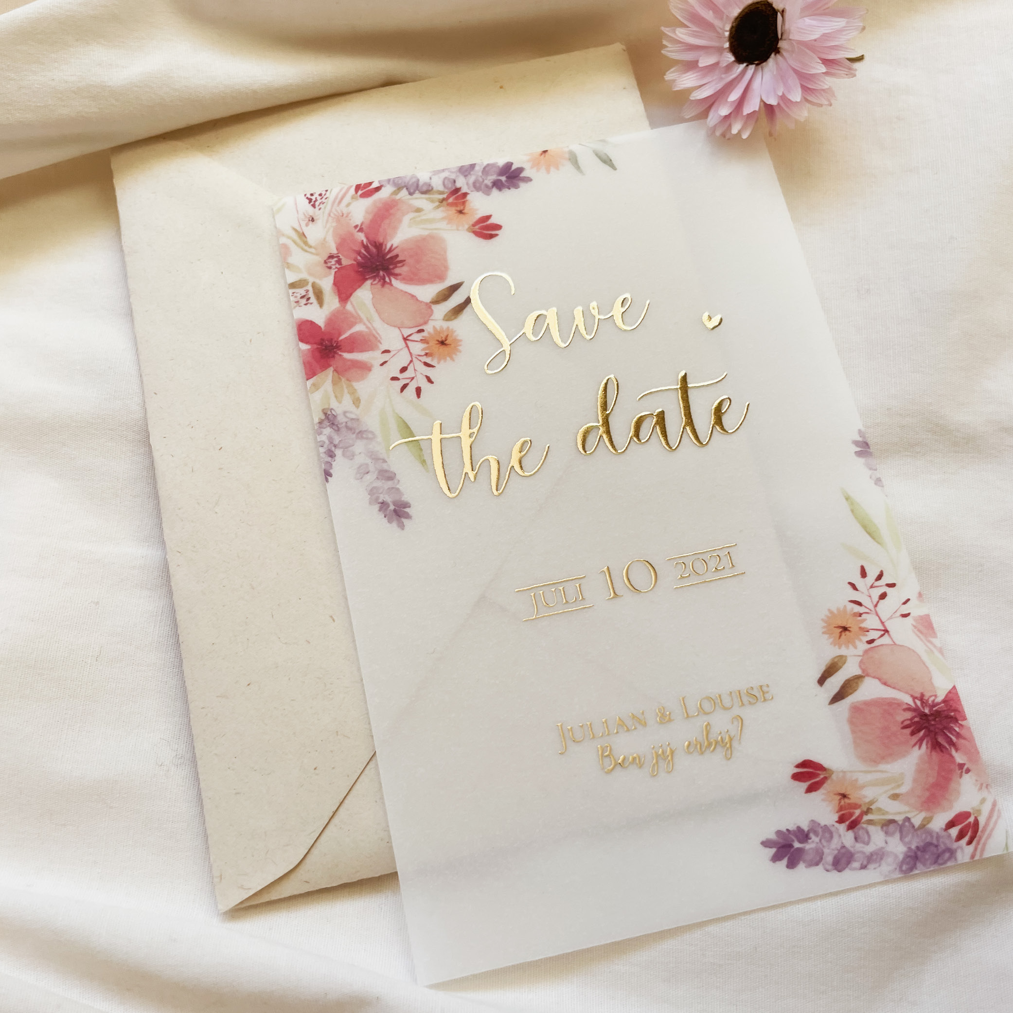 Een transparante save the date met bloemen is een vrolijke en stijlvolle manier om je gasten te laten weten wanneer je bruiloft is. De bloemen zijn met de hand geschilderd en komen mooi uit op het transparante kalkpapier. Voorzien van goudfolie, deze kaart is perfect voor een romantische bruiloft.