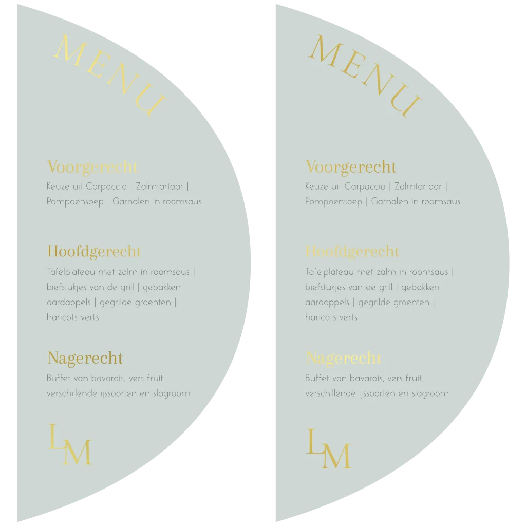 Halve boog lichtgroene menukaarten met goudfolie. Pas de kaart naar wens aan in de online editor!