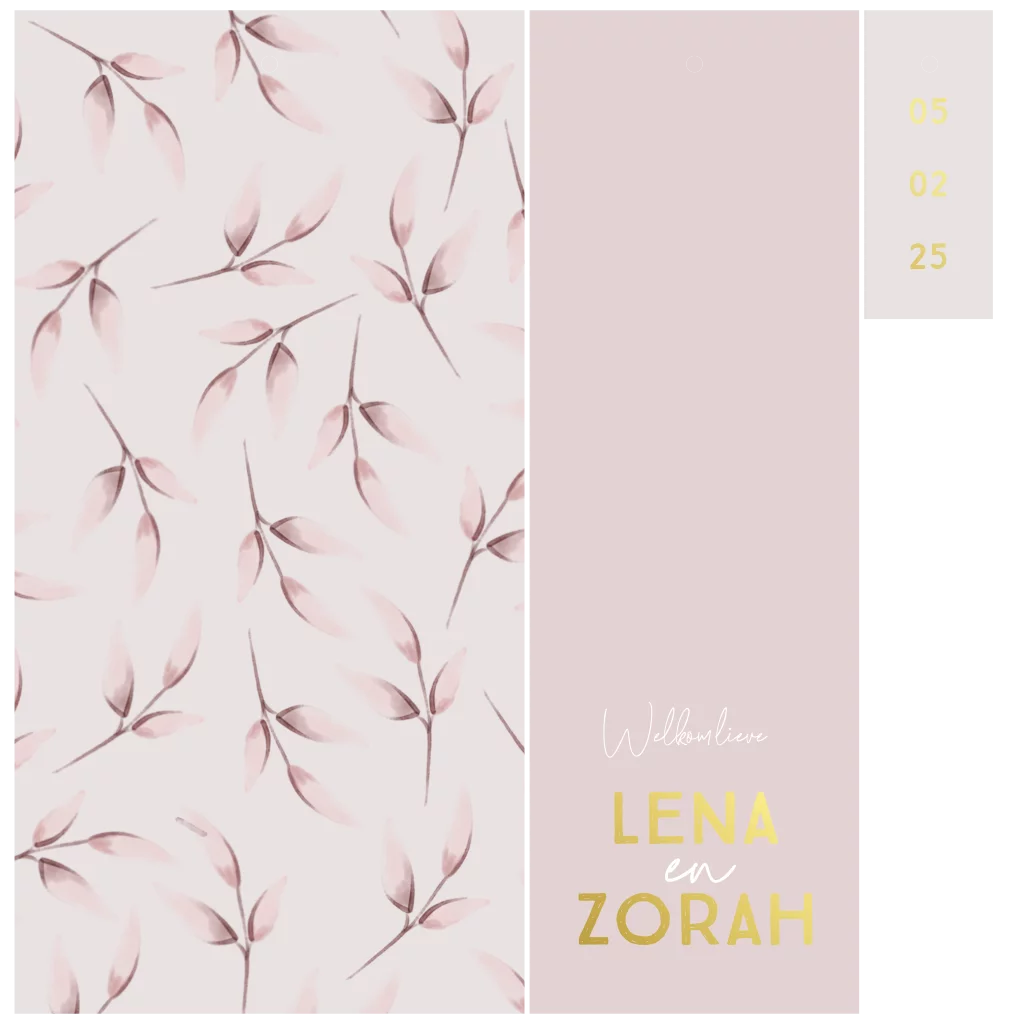 Lief roze tweeling geboortekaartje met goudfolie en extra kaartjes met de naam en datum. Pas het kaartje naar wens aan in de kleuren die jij mooi vindt! Let op: De kaart wordt geleverd zonder lint. Je kunt het lint: fluweel lint oud roze zoals op de foto bijbestellen via de volgende link: https://lindesigned.nl/touwtjes