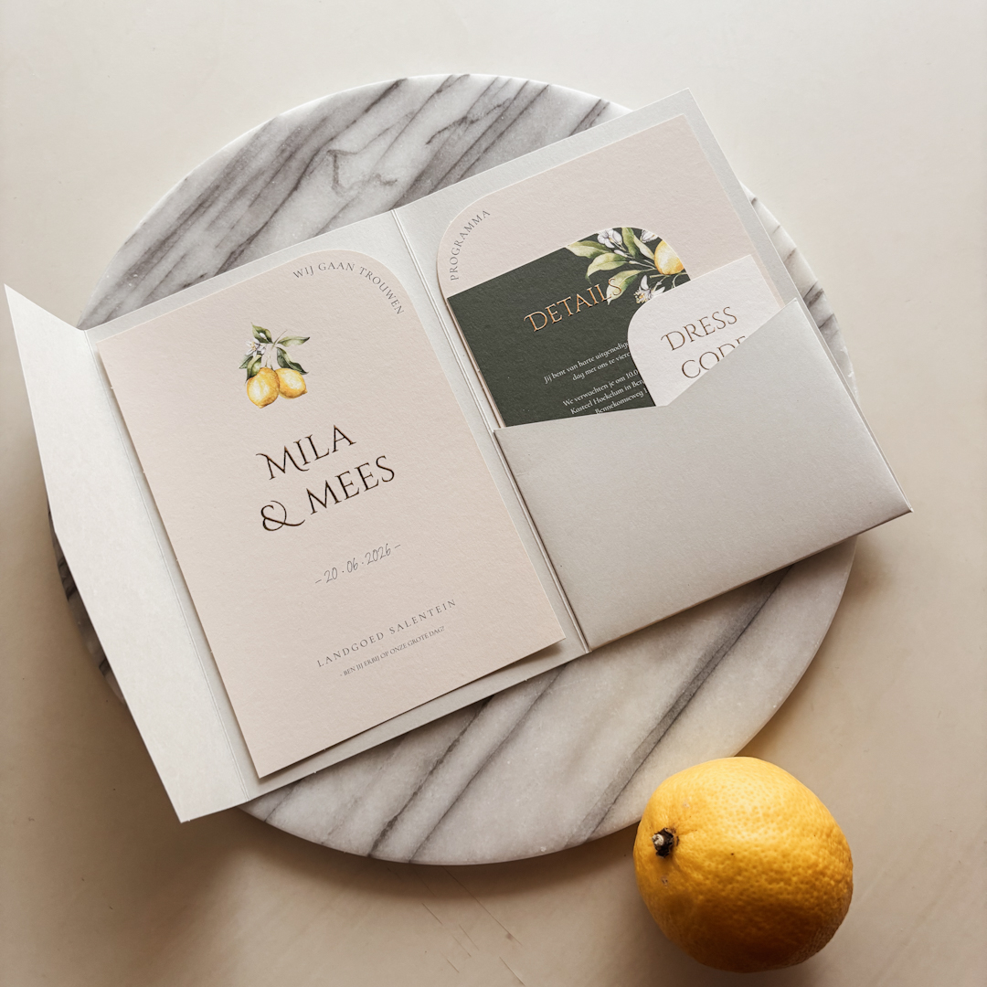 Groene Italiaanse stijl pocketfold set. Deze set met meerdere kaarten is voorzien van frisse kleuren zoals groen, geel en lichtblauw. Je kunt dit natuurlijk naar wens aanpassen! Mooie kaart in Italiaanse stijl met citroenen.