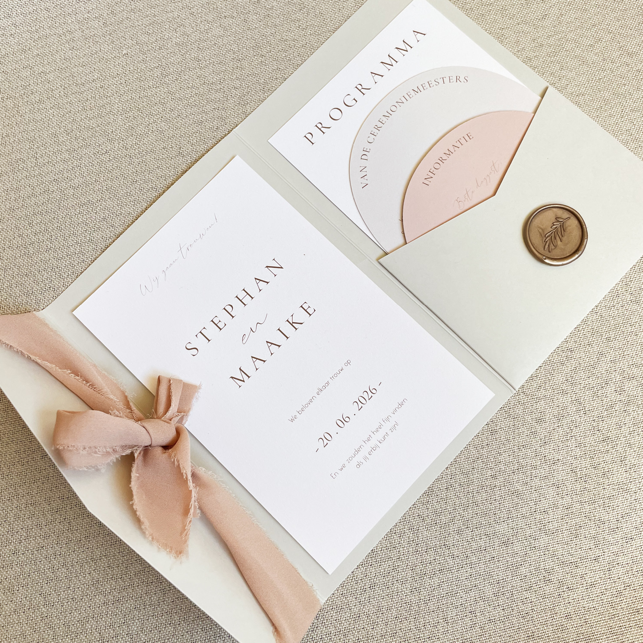 Pocketfold trouwkaart set in natuurlijke kleuren. Deze trouwkaart in aardetinten is voorzien van twee rechte kaartjes en twee boogvorm kaartjes. Deze voeg je samen in een pocketfold tot een prachtig geheel: echt een cadeautje in de brievenbus! Let op: De kaart wordt geleverd zonder lakzegel en lint. Je kunt de lakzegel en het lint: Chiffon zijden lint beige zoals op de foto bijbestellen via de volgende links: https://lindesigned.nl/lakzegels & https://lindesigned.nl/touwtjes