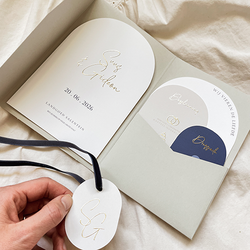 Prachtige pocketfold trouwkaart met 4 inlegkaarten en een label met goudfolie. De kaart is voorzien van de kleuren blauw, wit en zand en is helemaal naar wens aan te passen. Let op: De kaart wordt geleverd zonder lint. Je kunt het lint zoals op de foto bijbestellen via de volgende linkjes: https://lindesigned.nl/mooie-lintjes en via https://lindesigned.nl/touwtjes