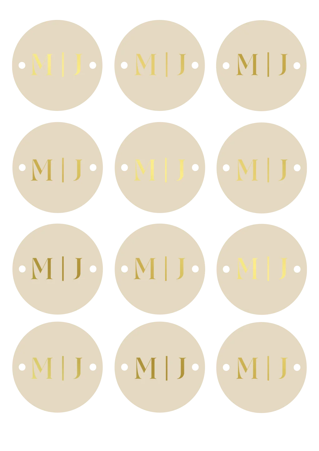 12 ronde labels met gaatjes aan beide zijden. De labels hebben het formaat 55x55mm.