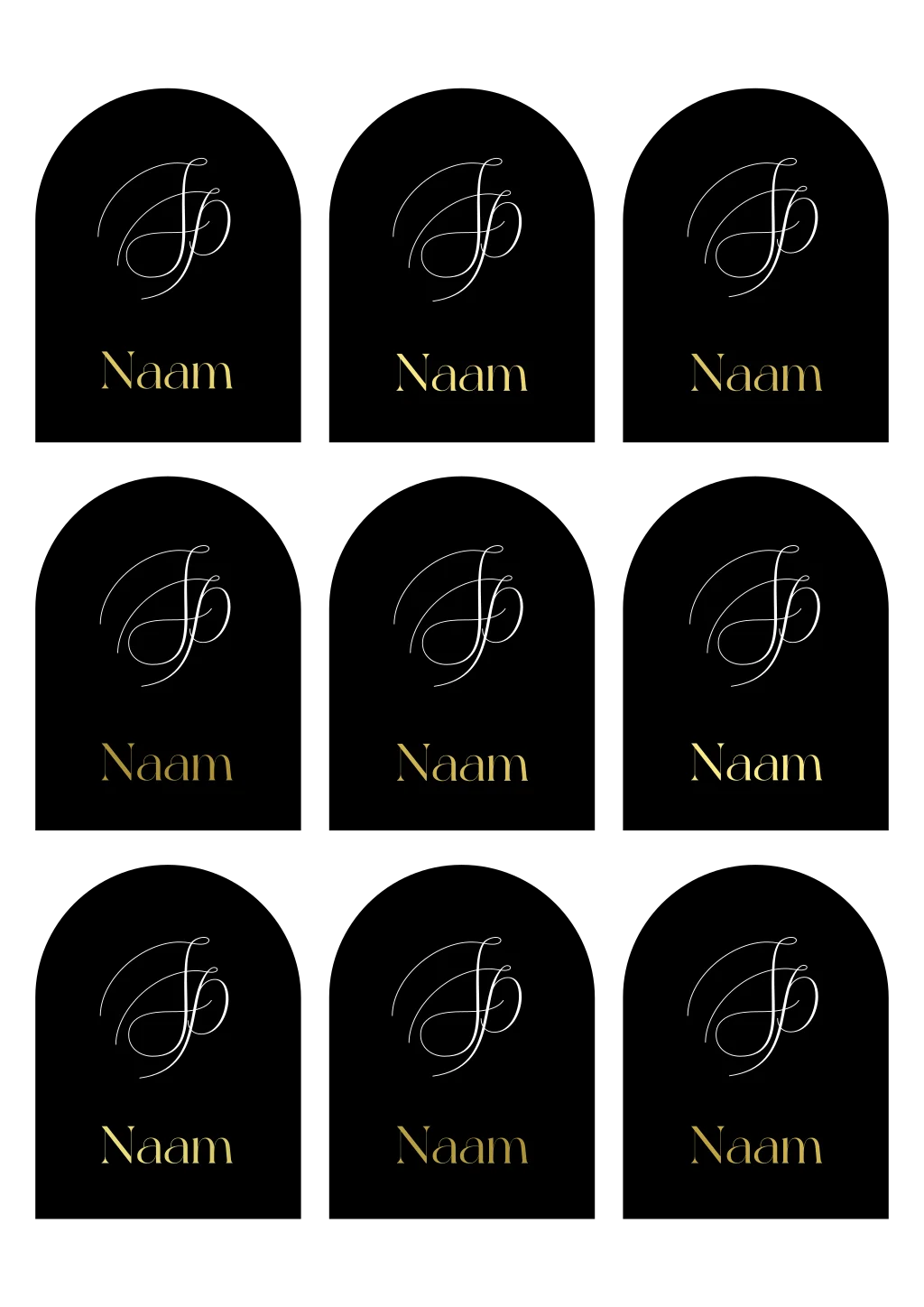 Zwarte boogvorm naamkaartjes, voorzien van initialen van het bruidspaar en de naam van de gast in goudfolie. Bewerk deze naamkaartjes geheel naar wens in de online editor.