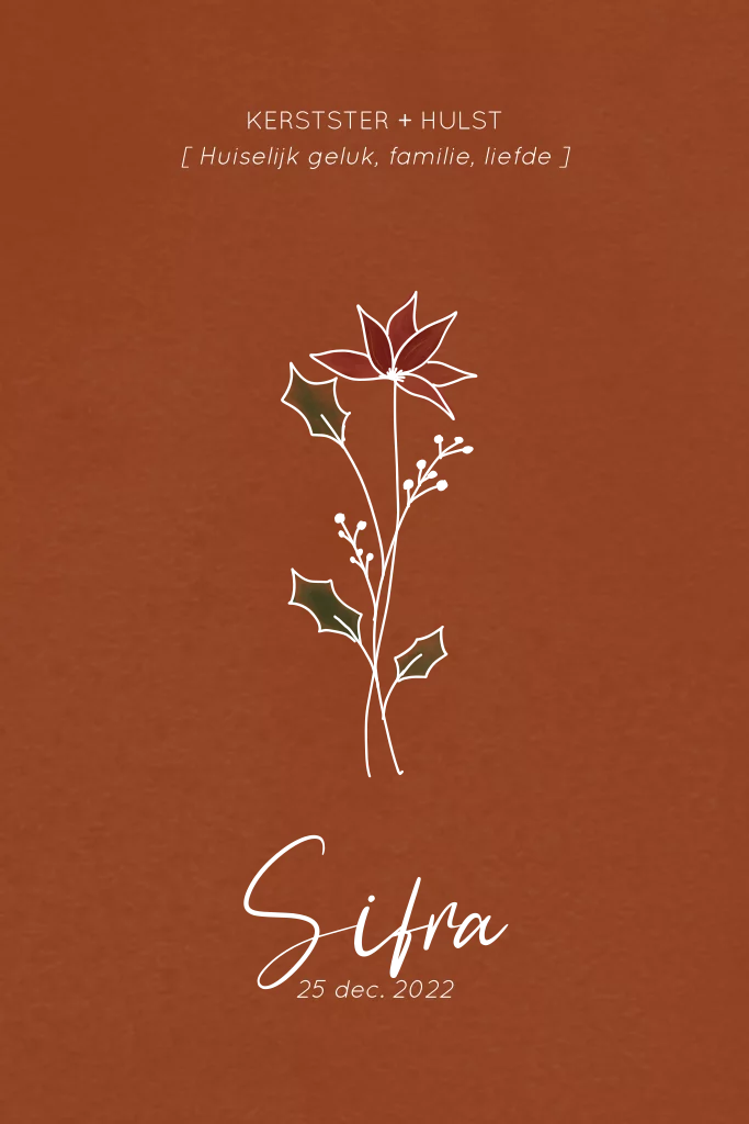 Mooie poster voor de babykamer in roestkleur en met goudfolie. De betekenis van de geboortebloem van december: kerstster + hulst, staan erop! Je kunt deze poster zelf naar wens aanpassen.